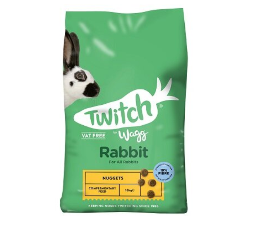 Twitch by Wagg Rabbit Nuggets. A complementary rabbit feed is designed to be fed alongside a diet that is up to 85% hay or fresh grass. Rabbit Nuggets contain 19% fibre and yeast extracts to keep your rabbit’s digestive system healthy. A variety of high quality ingredients are all combined into a single nugget formula to avoid selective feeding and promote a balanced diet.